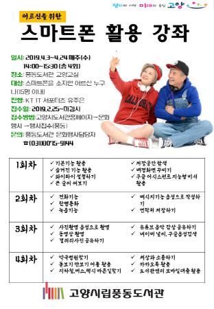 고양시 풍동도서관은 오는 4월 3일부터 24일까지 4회에 걸쳐 매주 수요일 ‘어르신을 위한 스마트폰 이용교육’을 진행한다.