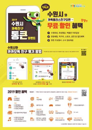 모바일 메신저 카카오톡에서 ‘수원시’와 친구를 맺으면 박물관·미술관, 관광체험 시설, 문화공연, 주요 관광지, 스포츠 경기 등을 무료·할인 가격으로 이용할 수 있는 이벤트다.