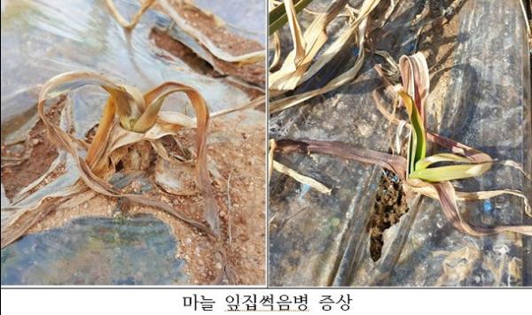 도 농업기술원에 따르면 최근 도내 마늘 주산단지인 서산시와 태안군 농가포장에서 잎집썩음병이 발생되었고 기온이 상승하면서 급격한 확산을 우려했다.