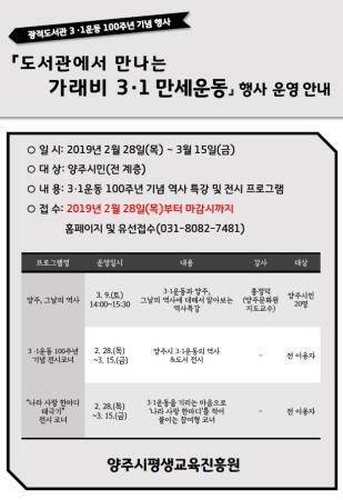 양주시 광적도서관은 오는 3월 15일까지 3·1운동 100주년 기념, ‘도서관에서 만나는 가래비 3·1 만세운동’ 행사를 운영한다.
