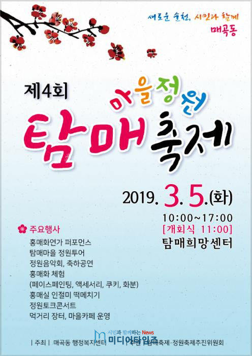 이번 축제에서는 홍매화를 매곡동의 대표 나무로 공표하고, 순천시에서 추진 중인 ‘천만그루 나무심기운동’의 성공을 기원하며 기념식수도 진행할 예정이다. 또한 홍매화를 테마로 한 체험과 전시, 탐매마을 주민의 염원을 담은 홍매화연가 퍼포먼스, 축하공연 등 다양한 프로그램도 준비됐다.