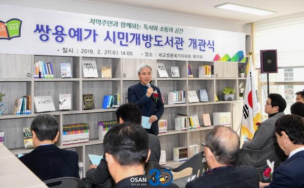 세교쌍용예가아파트의 관리동 2층에 위치한 시민개방도서관의 규모는 300㎡로 북카페, 어린이자료실, 일반자료실, 문화강좌실로 구성되어 있으며, 7,576권의 장서를 비치했다.