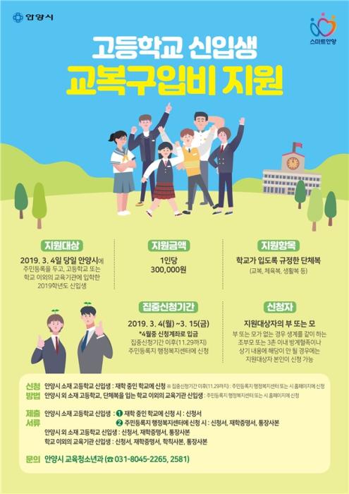 대상은 금년 3월 4일 기준 주민등록지가 안양이면서 교복을 착용하는 고등학교에 입학하는 신입생이다.
