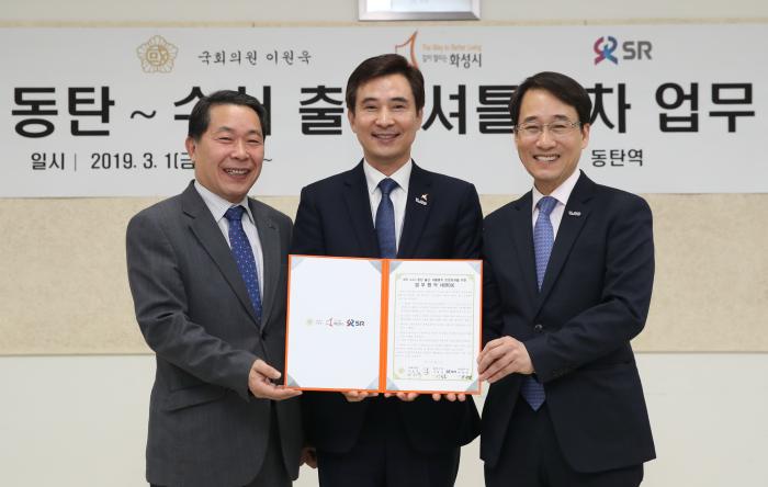 서철모 화성시장, 이원욱 국회의원, 권태명 ㈜ SR 대표이사는 1일 동탄역에서 셔틀운행 활성화를 위한 업무협약도 체결했다.