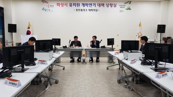 시는 4일 오전 7시 동탄 출장소에 ‘유치원 개학연기 대책 상황실’을 설치하고 서철모 화성시장 주재로 관련 실과소 담당 공무원이 자리한 가운데 대책회의를 개최했다.