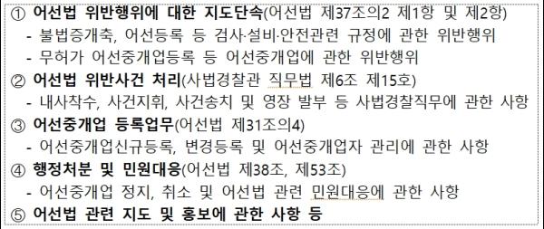 전담반은 어선 불법 증 · 개축, 무허가 어선중개업 등록 등 어선법 위반행위에 대한 지도 · 단속을 실시하고, 어선법 위반 사건처리와 어선중개업 등록업무 등을 수행하게 된다.