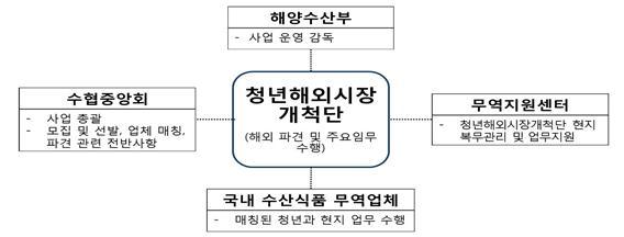 청년들은 현지의 수산식품기업들과 1대 1로 연계되어 해외 마케팅을 경험하게 되며, 각 국가에 설치된 무역지원센터에서 해외시장조사 바이어 발굴 수출업체 지원 등의 역할을 수행하게 된다.