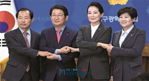 2018.11.22. 대구시장, 시의회의장, 교육감, 서구청장 중학교 무상급식 시행 공동 발표 <대구시 제공>