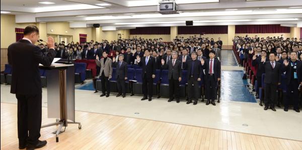 도성훈 인천광역시교육감과 신규전입직원 84명, 400여명의 직원들이 4일 인천광역시교육청 행복소통만남회의에서 ‘권위주의, 갑질, 차별없는 인천교육’실천을 위한 다짐 결의를 했다.