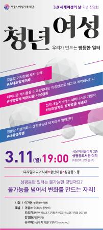 이에 서울시여성가족재단은 3.8세계여성의날을 맞아 오는 11일 오후 7시, 서울여성플라자 2층 성평등도서관 여기에서 ‘청년여성, 우리가 만드는 평등한 일터’ 집담회를 개최한다.