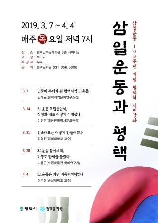 평택문화원 김은호 원장은 “평택학 시민강좌는 평택시민들이 평택의 역사적 지식과 더불어 인문학적 소양을 쌓을 수 있는 강좌”라며 “이번주제인 ‘3.1운동과 평택’을 통해 3.1운동 100주년을 기념하고 이해하는 시간이 되었으면 한다”고 말했다.