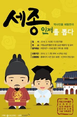 이는 조선의 왕 세종을 주제로 한 연극과 체험이 융합된 공연으로, 어린이들은 능력 있는 인재 발굴을 위한 과거시험에 직접 참여해 체험도 해볼 수 있다. 공연 참가는 어린이 동반 가족 총 100명으로, 오는 7일부터 홈페이지에서 선착순으로 80명까지 사전신청을 받으며, 남은 인원은 현장에서 신청받는다.