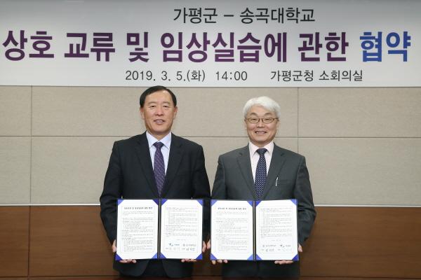 가평군과 송곡대학이 상호교류 및 임상실습에 관한 협약을 체결하고 군과 대학의 상호발전에 기여하기로 합의했다.
