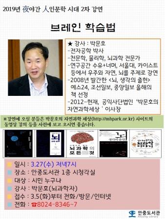 오는 27일 저녁 7시에 진행되는 시즌 2의 첫 번째 강좌는 뇌 과학자 박문호 박사를 초청해 ‘브레인 학습법’을 주제로 뇌의 구조와 기능을 비롯해 우주와 생명 탄생까지 망라하는 강연으로 ‘뇌’라는 제한된 영역에 그치지 않고 방대한 과학 지식을 ‘뇌 과학’의 시각에서 탐구하는 시간이 될 것으로 기대된다.