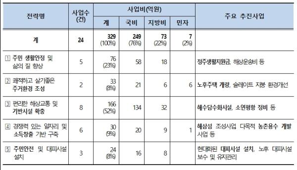정주생활지원금 지원 등 주민 생활안정 및 삶의 질 향상 사업 5개, 76억원, 노후주택 개량사업 등 주거환경 조성사업 2개, 33억원, 해수담수화시설 신축 등 기반시설 확충 사업 8개, 166억원, 해삼섬 조성사업 등 일자리 및 소득창출 기반 사업 6개, 30억원 등을 지원한다.