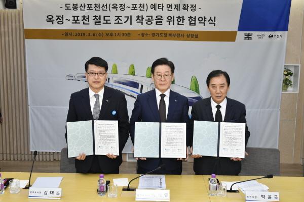 지난 1월 29일 예비타당성조사 면제 대상사업으로 선정된 도봉산포천선 전철7호선 건설사업의 조기 착공을 위한 경기도, 포천시, 양주시 간 협약식이 6일 경기도 북부청사 상황실에서 개최됐다.