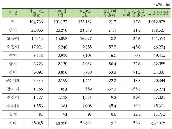 해양수산부는 2019년 1월 연근해어업 생산량이 지난해 1월에 비해 22% 증가했다고 밝혔다.