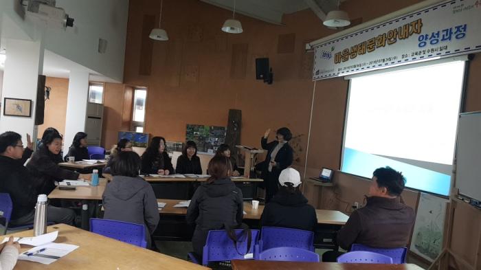 | 시민들이 6일 칠보생태환경체험교육관에서 열린 ‘2019 마을생태문화 안내자 양성과정’을 교육을 듣고 있다. |
