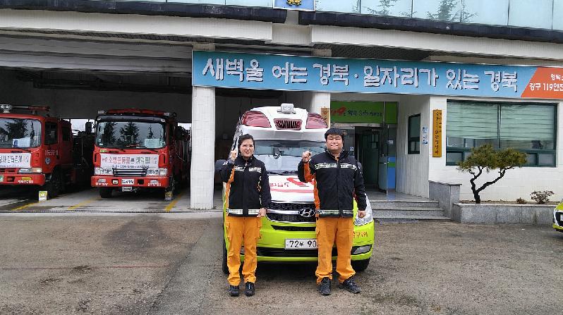 화제의 주인공들은 영덕소방서 강구119안전센터 구급대원(소방장 고령임, 소방교 이종호)으로 설 명절을 앞두고 발생한 심정지 환자를 소생시켜 소중한 생명의 의미를 더하고 있다. 이들은 관할 지역(영덕군 강구면)에서 119신고를 받고 현장에 출동해 심정지 환자(60대 남성)에게 제세동 전기충격 및 심폐소생술 등 전문적인 응급처치를 시행해 구급차량 내에서 환자 의식, 맥박, 호흡을 회복시켜 안전하게 병원으로 이송하였다.