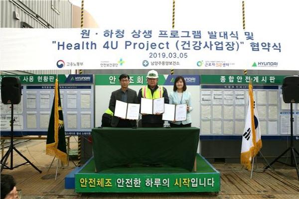 지난 5일 경기북부 근로자건강센터는 현대건설힐스테이트 별내 스테이원, 남양주시풍양보건소와 근로자건강증진활동 일환으로 Health 4U project를 위한 업무협약을 체결했다.