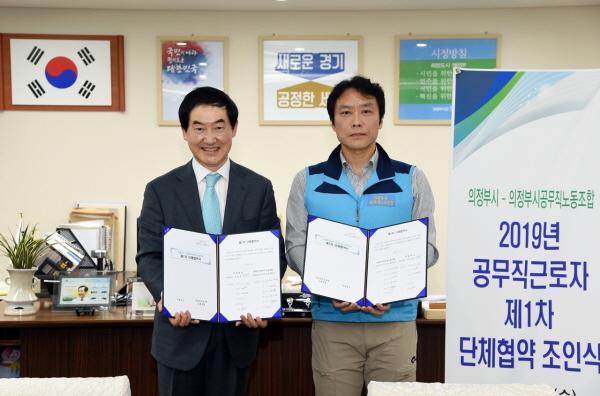 의정부시와 의정부시공무직노동조합은 지난 6일 시청 시장실에서 의정부시 공무직 노사 단체협약 조인식을 갖고 상호 협력을 다짐했다.