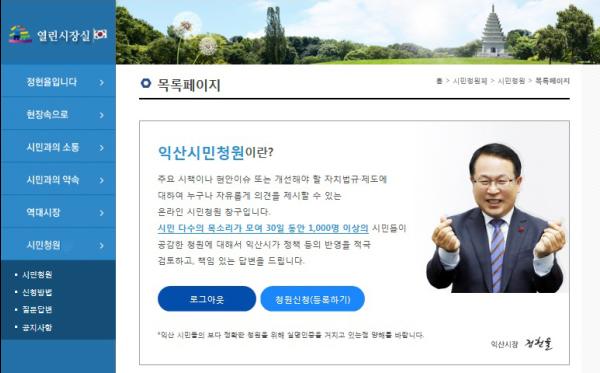 시민누구나 휴대폰 또는 아이핀으로 본인 확인을 거친 후 시 홈페이지의 메인화면에 마련된 ‘익산시장 정헌율입니다 - 시민청원’게시판을 통해 자유롭게 의견을 개진할 수 있으며, 30일간 1,000명 이상의 공감을 받은 청원은 20일 이내에 공식답변이 제공된다.