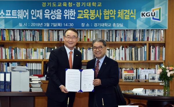 경기도교육청은 경기대학교와 도내 초·중·고등학교 소프트웨어 교육을 위해 7일 ‘소프트웨어 인재육성을 위한 교육봉사 업무협약식’을 가졌다.