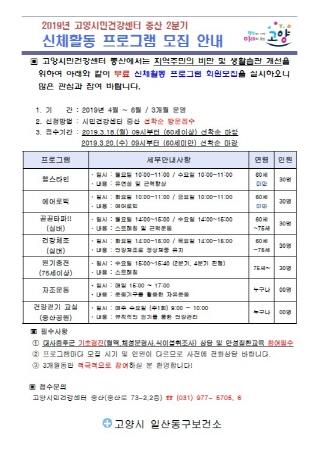 고양시 일산동구보건소에서 운영하는 시민건강센터·중산에서 대사증후군 예방 및 생활습관 개선을 위한 ‘2019년 2분기 신체활동 프로그램’ 참가자를 모집한다.