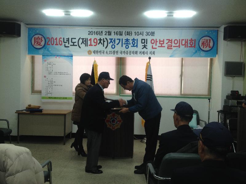 정기총회 1부 행사로 6.25참전유공자회 거제시지회 회원 모두의 이름으로 아주동 주민센터 신삼남 동장님에게 감사패를 전달하였고, 모범 국가유공자에 대한 거제시장 표창(김태진 장승포분회장), 경남동부보훈지청장 표창(연초면 장원순 여성회원), 6.25참전유공자회 경남지부장 표창(김종문 하청면분회장) 수여식이 진행 되었으며,