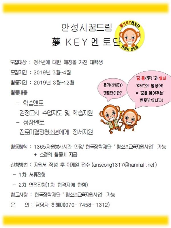 몽키 대학생 멘토단 모집에 관한 자세한 사항은 안성시학교밖청소년지원센터 꿈드림으로 문의하면 된다.
