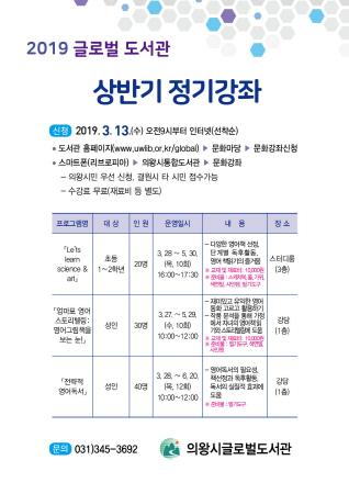 의왕시 글로벌도서관은 오는 13일부터 2019년 상반기 정기강좌 접수를 받는다.