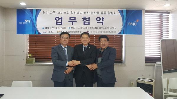 파주시는 지난 8일 한국외식업중앙회 파주시지부 사무실에서 한국외식업중앙회 파주시지부·파주시 농업인단체협의회와 3자간 업무 협력·교류 체계를 구축해 농산물 유통 활성화 및 건강한 식생활 문화 확산 등 농산업 발전을 위한 업무 협약식을 가졌다.