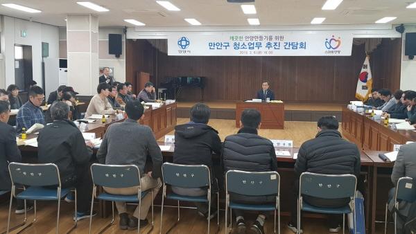 안양시 만안구는 지난 8일 만안구청에서 깨끗한 안양 만들기를 위한 청소행정업무 추진 간담회를 개최했다. 이번 간담회에는 만안구청장, 환경위생과 실무자, 각 동의 청소행정업무담당 및 가로환경미화원 반장 등 40여명이 참석했다.