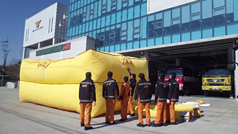 영덕소방서(서장 오원석) 영덕119안전센터(센터장 김영회)는 17일 오후 차고 앞에서 공기안전매트 조작 훈련을 실시하였다. 공기안전매트는 2층의 구조로 되어 있으며 낙하하는 물체의 충격량에 따라 4면의 공기배출구를 통해 적당하게 공기를 자동 배출하여 낙하하는 물체에 가해지는 충격을 최소화 하는 장비이다. 또한 직원들을 대상으로 에어매트 제원과 설치법, 전개 시 주의사항 및 안전사고 방지 교육을 각각 시행하였다.