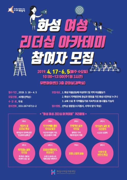 화성시여성가족재단은 화성시 여성리더 양성 전략사업 ‘화성 여성리더십 아카데미’를 오는 4월17일부터 6월5일까지 매주 수요일마다 유앤아이센터에서 운영할 예정이라고 밝혔다.