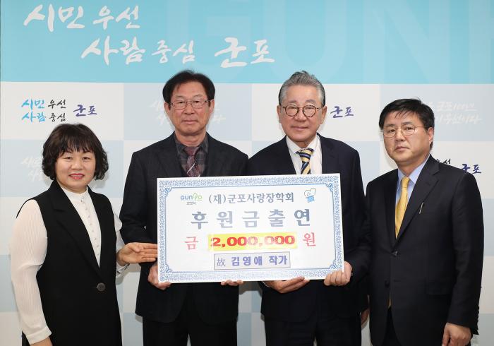 군포시는 12일 고인이 된 김영애 작가로부터 지역 청소년을 위한 장학금을 전달받았다고 밝혔다.
