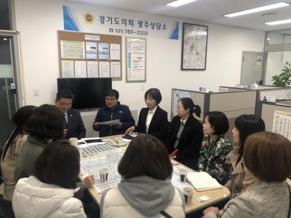 경기도의회 광주상담소에서 안기권도의원, 박관열, 이은채 광주시의원은 12일 광주초등학교 학부모회 임원들과 광주초교 어린이 안심통학로 유니버설 디자인 조성사업과 관련해 토론하는 자리를 마련했다.
