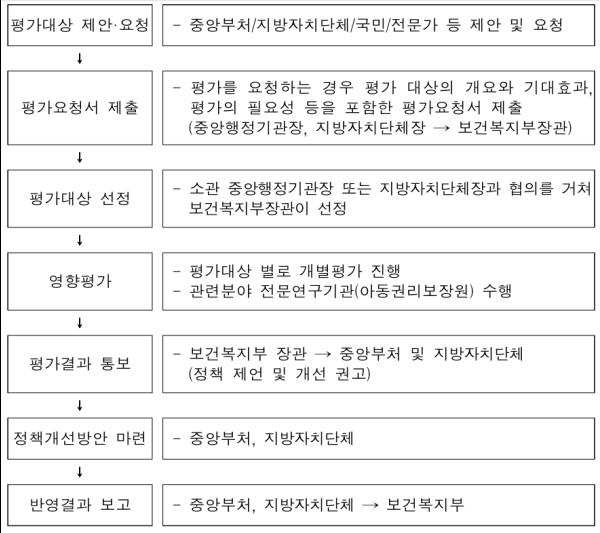 중앙부처나 지방자치단체가 아동 관련 정책을 수립하려는 경우 직접 아동정책영향평가를 하거나, 보건복지부장관에게 아동정책영향평가를 해 줄 것을 요청할 수 있게 했다.