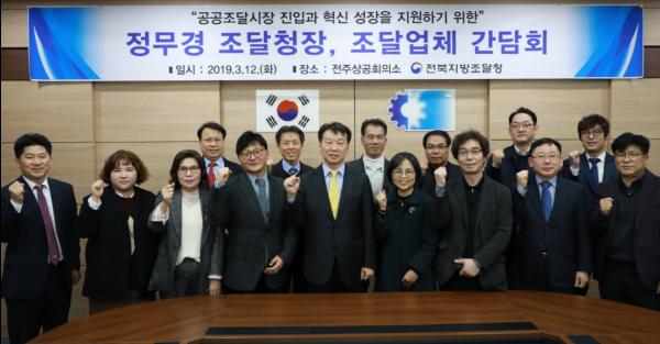 정무경 조달청장은 12일 전주시 완산구 전주 상공회의소에서 창업·벤처기업, 우수조달기업 등 13개 사를 초청, 기술력 있는 창업·벤처기업들의 공공조달시장 진입을 통해 혁신성장 할 수 있는 방안 등을 논의하기 위한 간담회를 가졌다.