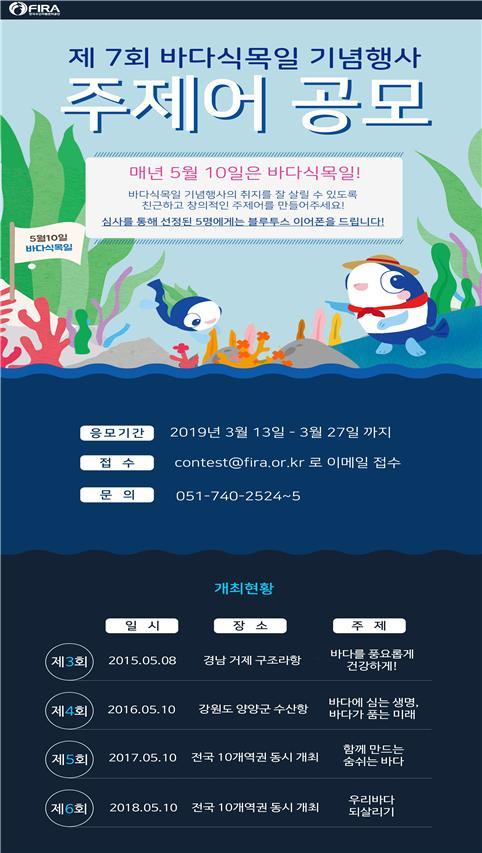 올해 대국민 공모전은 제7회 바다식목일을 기념하기 위한 어린이 그림, 동영상, 수중사진 공모분야와 주제어 공모분야로 나뉘어 실시된다.