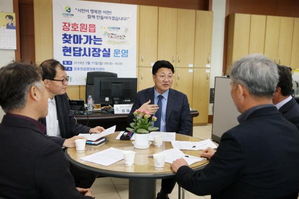 찾아가는 현답시장실 ‘장호원편’에서는 장호원의 교육환경 개선, 장호원3리 마을회관 신축, 시도14호선 확포장, 장승배기천 식생블럭정비, 가로등 신설, 장호원시가지 간판개선사업 등 마을별 소소한 사업부터 대규모 투자사업까지 하루 종일 접견자가 줄을 이었다