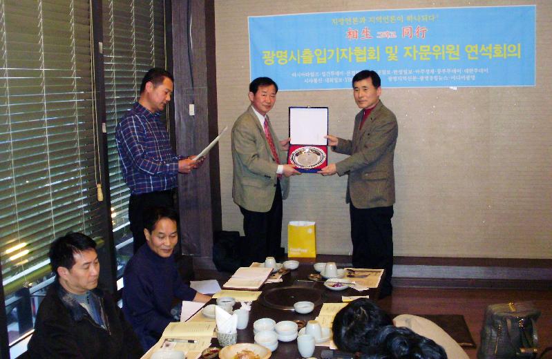 광명시출입기자협회(회장 신용환, 아시아타임즈)와 기자협회 자문위원회(위원장 박준철)는 지난 난 12일 광명시 노온사동 명가원에서 2회째 정기모임 및 박영환 신입 자문위원으로부터 연회비(현금 1백만원) 전달식을 가졌다.기자협회와 자문위원회는 지난달 26일 철산동 오대양참치에서 첫 정기모임을 가지고 올바른 기자상 정립은 물론 지역사회의 어둡고 쓸쓸한 이웃에게 희망의 등불이 되고자 출범해 지난 6일 광명시지체장애인협회에 귤 100박스를 전달하는 기부행사를 갖았었다.12일 두 번째 정기모임은 광명시평화통일자문회의 12기, 13기 시절 북한에 연탄전달 및 밀가루전달 등 무기명으로 남몰래 특별회비를 전달해 오던 신입 박영환(58세, 주식회사 아리코그룹 대표) 자문위원은 숨은 봉사자로서 자신의 치적을 숨겨왔다.