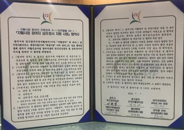 이날 협약은 광주시와 경기광주지역자활센터, 심리상담센터 about me, 마음소리미술심리치유센터, 톰소여언어심리운동센터, 아이뜰심리지원센터 등 6개 기관이 업무협약을 연장했으며 각 협약기관은 자활사업 참여자들의 성공적인 자활을 위해 무료로 심리·정서 프로그램을 지원키로 했다.