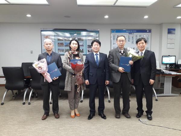 표창 수여자는 ㈜일석종합건축사사무소 이호일 건축사, 성문건축사사무소 조영학 건축사, 건축사사무소미고 정은영 건축사 3인이다.