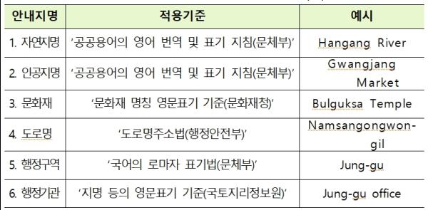 영문표기 통일성 확보를 위해 안내시설을 특성에 따라 6개 항목으로 분류하고 ‘안내지명 종류별 적용기준‘을 정립했다. 또한, 각 기관에서 적용하기 쉽도록 영문표기 용례집도 배포할 계획이다.