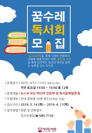 인천서구도서관은 청소년들의 지속적이고 체계적인 독서 및 자기주도 학습 능력 신장을 위해 2019 서구도서관 ‘꿈수레 청소년 독서회’를 운영한다.