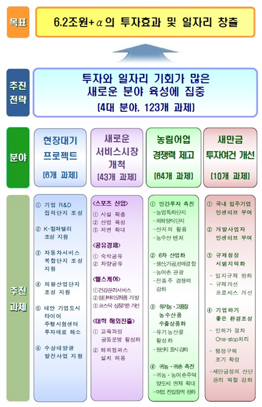 이밖에 고양 K-컬처밸리, 의왕산업단지, 태안 기업도시내 주행시험센터, 농어촌 저수지를 활용한 수상태양관 발전사업 등을 추진하면 총 6조2000억원의 투자효과가 나타날 것으로 정부는 기대하고 있다.