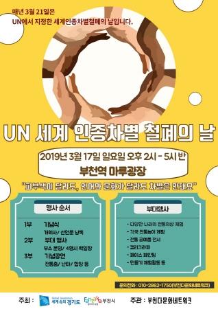 부천다문화네트워크에서는 UN 세계인종차별철폐의 날을 맞아 오는 17일 부천마루광장에서 ‘세계인종차별철폐 캠페인’을 개최한다.