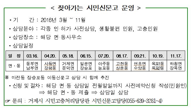 거제시에서 추진하는 ‘찾아가는 시민 신문고’는 시청을 방문하기 힘든 시민들을 위해 직접 해당 면·동으로 찾아가 시민들의 애로사항을 듣고 해결하는 현장민원 상담제도다.