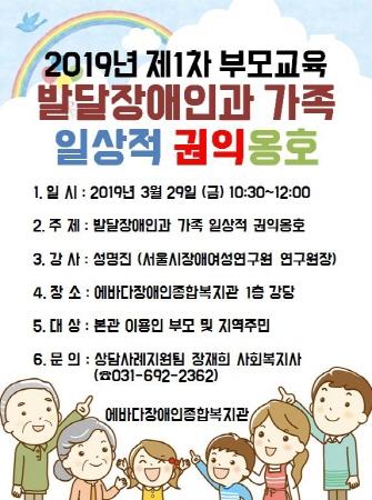 에바다장애인종합복지관에서는 오는 29일 10시 30분부터 12시까지 지역 장애인 부모 및 교육에 관심이 있는 지역주민에게 ‘발달장애인과 가족, 일상적 권익옹호’을 주제로 부모교육을 실시한다.